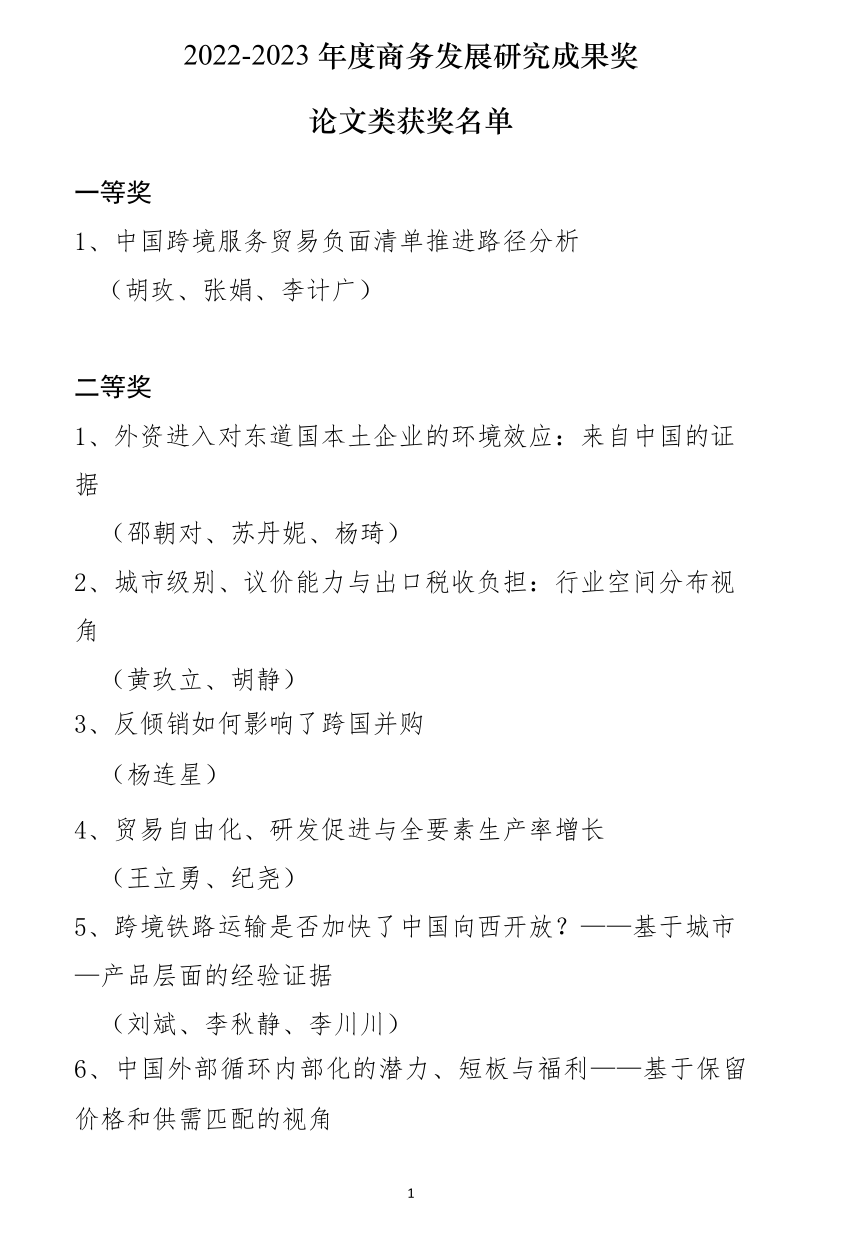 近日,商务部2022-2023年度商务发展研究成果奖评选结果揭晓,我院聂飞与合作者李磊申报的《制造业企业对外直接投资、去工业化及其对全球价值链分工地位的影响》获论文类优秀奖。