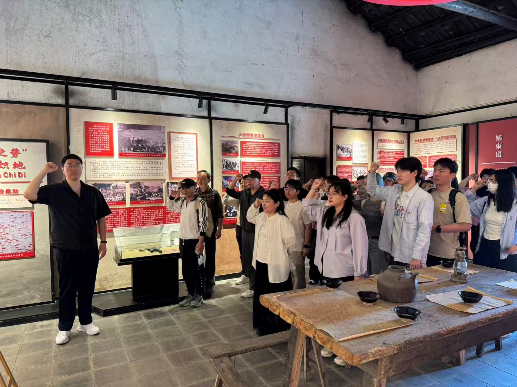 随后,大家步入大箕铺镇红色文化展馆,在讲解员的带领下,通过珍贵的历史图片、实物展品、文字史料,详细了解大箕铺镇作为湖北省重点老苏区的红色历史,深刻认识这片土地在革命年代的重要战略地位。讲解员介绍,大箕铺因其优越的地理位置和丰富的铜铁资源,在革命战争年代成为党组织开展工人运动和农民运动的重要区域。在“鄂东南第一个农村党支部”旧址前,全体师生党员整齐列队,面向鲜红的党旗,举起右拳,重温入党誓词。